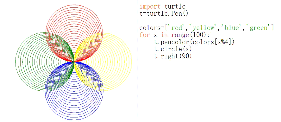 (5)这样一次一次地继续执行,当for循环遍历range中最后一个元素99时,变量x的值变为99,99除以4得到余数3,然后执行colors[3],从列表colors中取第四个元素“green”作为画笔颜色的参数。接着将画笔颜色设置为绿色(green),画一个半径为99的圆,然后画笔向右转动90°。这样就画出一个四种颜色的图形。