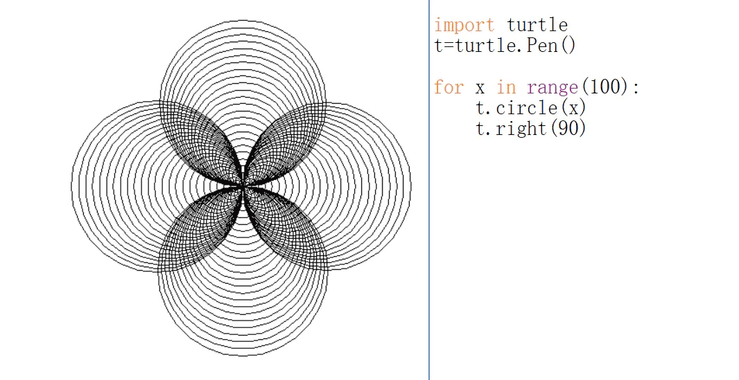 (2)接着range(100)会生成从0到99的连续的数;t.circle(x)语句让海龟画笔画出一个以x为半径的圆;t.right(90)语句让海龟画笔向右转动90°。