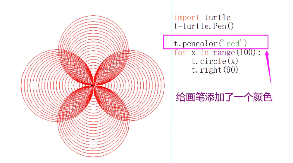 之前我们绘制的都是黑色的图形,接下来我们让海龟画笔画出彩色的图形。要绘制彩色的图形,只要将海龟画笔的颜色变成其他颜色即可。通过t.pencolor(‘red’)语句来设置画笔颜色。
