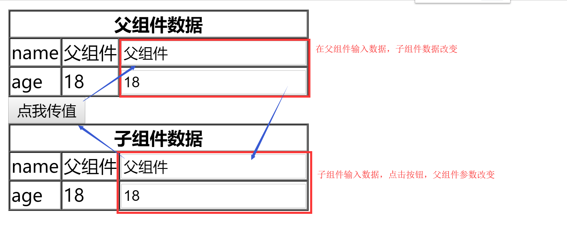 } setFage(event) { this.setState({fage: event.target.value, key: event.target.value}) } toData(data) { this.setState({fname: data.name}); this.setState({fage: data.age}); } render() { return ( <div> <table border="1" cellSpacing="0"> <tbody> <tr> <th colSpan="3">父组件数据</th> </tr> <tr> <td>name</td> <td>{this.state.nameFvalue}</td> <td><input value={this.state.fname} onChange={this.setFname.bind(this)}/></td> //受控组件当input值改变时触发方法setFname </tr> <tr> <td>age</td> <td>{this.state.ageFvalue}</td> <td><input value={this.state.fage} onChange={this.setFage.bind(this)}/></td> </tr> </tbody> </table><br> <br> //子组件标签里将父组件的数据传递给子组件,在子组件里利用props接收;key值变化时,子组件数据更新