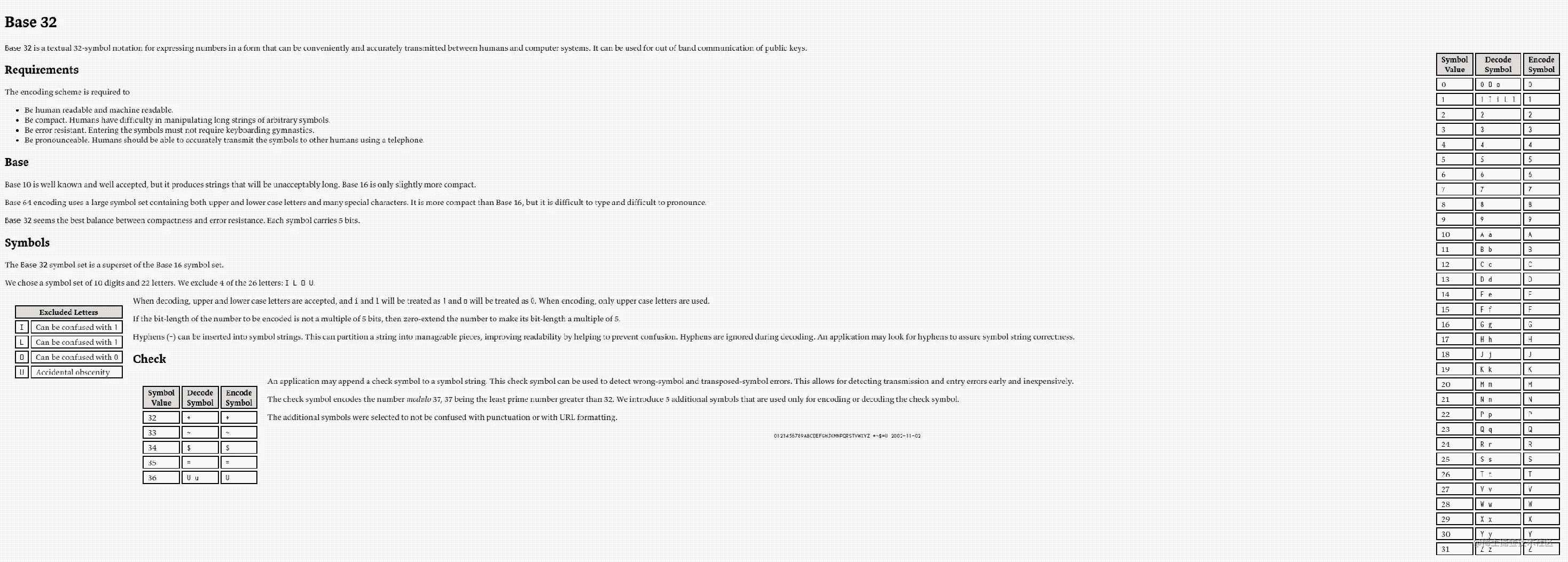 该字母表排除了I、 L、O、U字母,目的是避免混淆和滥用。此算法实现不难,它的官网有详细的算法说明(https://www.crockford.com/base32.html):