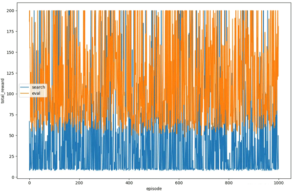 可以看到,每个回合的总奖励是非常随机的,并且并没有因为回合数的增加显示出改善的趋势。在训练过程中,可以看到在实现前期有些回合的总奖励已经可以达到 200,由于智能体的策略并不会因为回合数的增加而改善,因此我们可以在回合总奖励达到 200 时结束训练:
