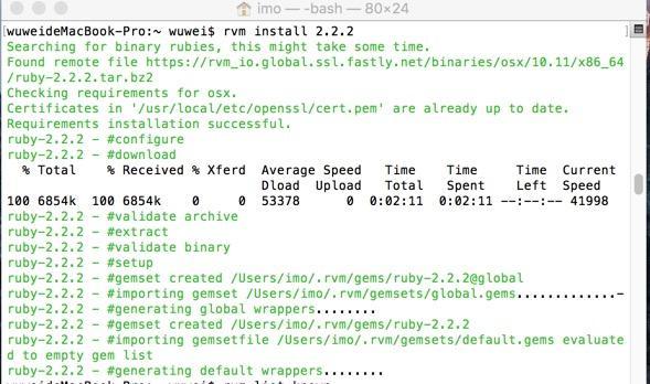 $ curl -L get.rvm.io | bash -s stable //需要等一会 $ source ~/.bashrc $ source ~/.bash_profile
