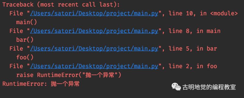 如果回退到最外层(模块)也没有找到异常捕获逻辑,那么解释器就要输出异常信息了,从模块对应的 traceback 开始不断遍历,将每一层信息都输出出来,就是我们看到的样子。