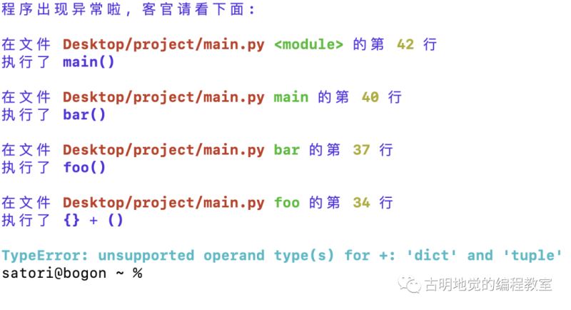 怎么样,是不是很好玩呢?只要把 sys.excepthook = cache 这段逻辑加载到程序中,我们就可以自定义异常显示信息了。