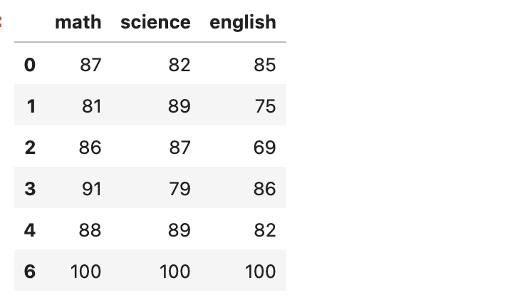 data = pd.DataFrame([ [87, 82, 85], [81, 89, 75], [86, 87, 69], [91, 79, 86], [88, 89, 82], [0, 0, 0], # this guy missed the exam [100, 100, 100], ], columns=["math", "science", "english"])