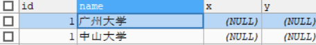 -- 创建数据库 CREATE DATABASE IF NOT EXISTS SchoolTownDB; -- 使用数据库 USE SchoolTownDB; -- 添加数据表 CREATE TABLE school( id INT, NAME VARCHAR(10), X DOUBLE, Y DOUBLE ); -- 添加数据 INSERT INTO school VALUE(1,'广州大学',NULL,NULL); INSERT INTO school VALUE(1,'中山大学',NULL,NULL); -- 展示数据表 SELECT *FROM school;