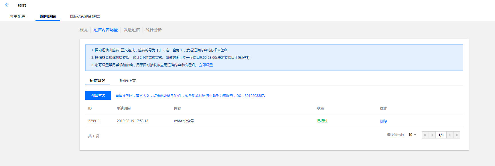 注:需先申请“短信签名”和“短信正文”,按照要求填写申请即可,腾讯云的审核效率还是很快的,一般在1-2个小时内就会有结果