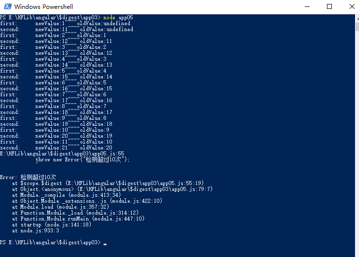 我们继续,给外层digest循环添加一个循环计数器。如果达到了TTL,就抛出异常: