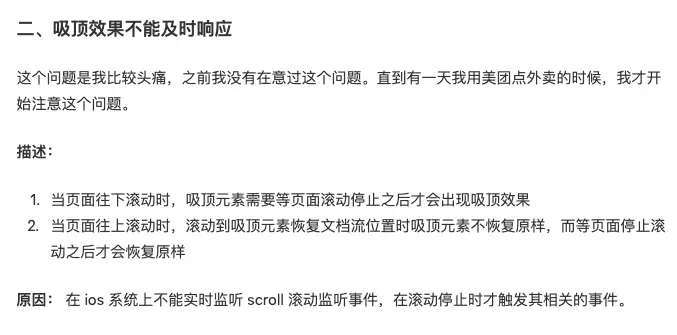 添加滑动onScroll事件=》滑动距离y等于第二部分marginTop的state,但是当滑动超过第一部分高度的时候把第二部分(吸顶部分)position设为absolute,并把其marginTop设为0,看起来不错,实际用ios模拟器一跑就无语了😅,效果很奇葩,手指滑动时不吸顶直接划上去隐藏掉大半,一松突然吸顶了。。。