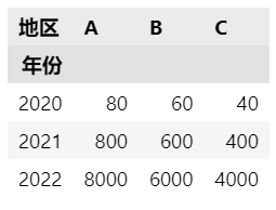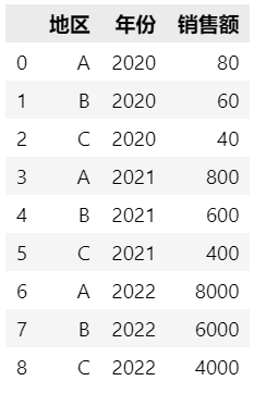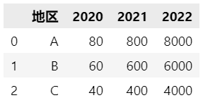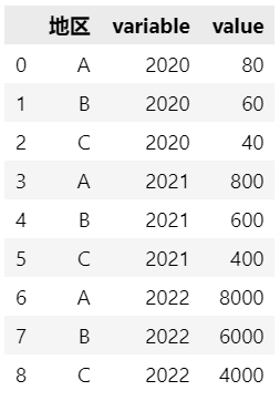 df = pd.melt(df, id_vars=['地区'], value_vars=['2020', '2021', '2022'], var_name='年份', value_name='销售额')