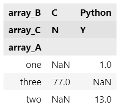 array_D = np.array([1, 4, 9, 16, 25, 36]) pd.crosstab(index=array_A, columns=[array_B, array_C], rownames=['array_A'], colnames=['array_B', 'array_C'], values=array_D, aggfunc='sum')