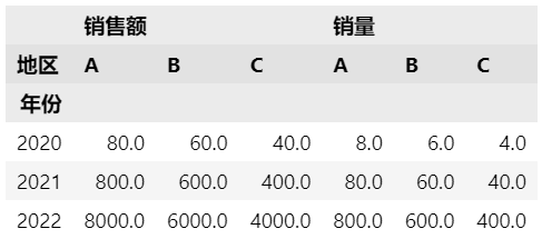 df['销量'] = df['销售额']/10 df.pivot(index='年份', columns='地区', values=['销售额', '销量'])