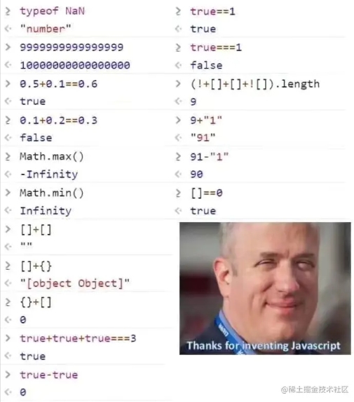 上图中typeof NaN会返回number,这可能和你想的不一样,在JavaScript准确的获取变量类型,并不简单,正因为如此,这个问题经常被用来考察面试者,由于程序=数据 算法,而基本数据是数据的基础,所以面试中考察类型也是合理的。