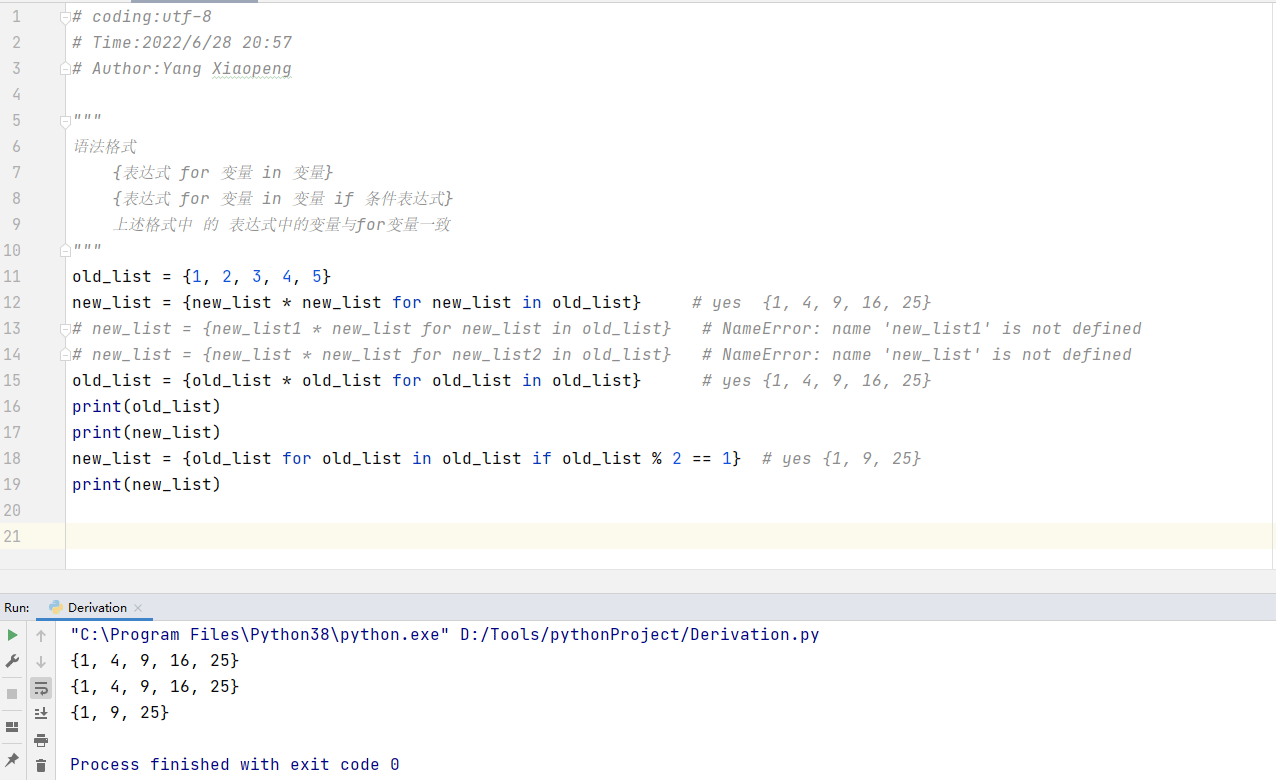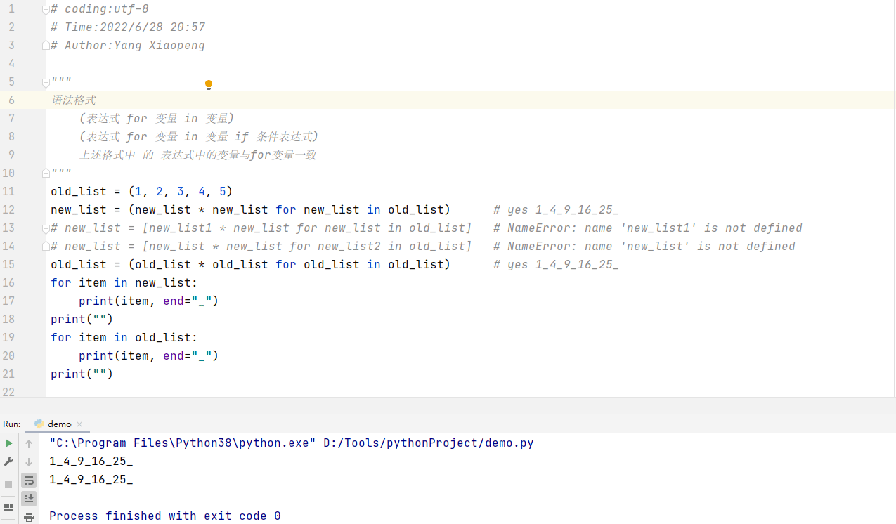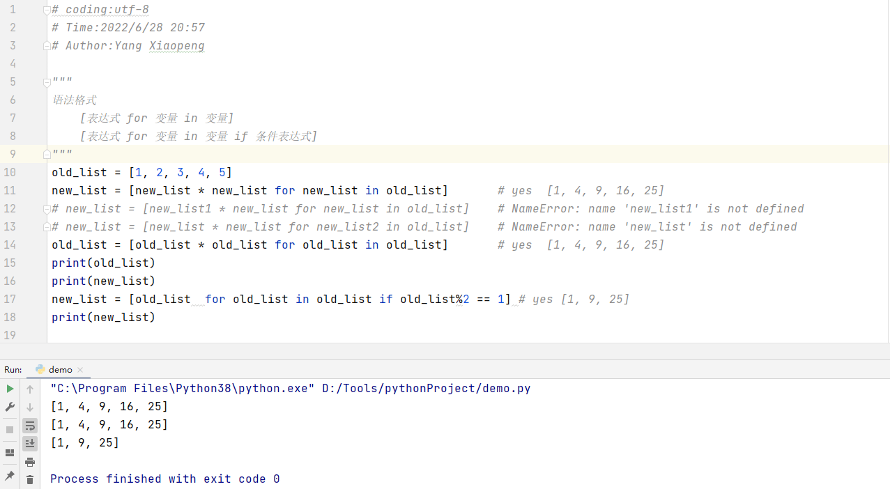 # coding:utf-8 # Author:Yang Xiaopeng """ 语法格式 [表达式 for 变量 in 变量] [表达式 for 变量 in 变量 if 条件表达式] 上述格式中 的 表达式中的变量与for变量一致 """ old_list = [1, 2, 3, 4, 5] new_list = [new_list * new_list for new_list in old_list] # yes [1, 4, 9, 16, 25] # new_list = [new_list1 * new_list for new_list in old_list] # NameError: name 'new_list1' is not defined # new_list = [new_list * new_list for new_list2 in old_list] # NameError: name 'new_list' is not defined old_list = [old_list * old_list for old_list in old_list] # yes [1, 4, 9, 16, 25] print(old_list) print(new_list) new_list = [old_list for old_list in old_list if old_list%2 == 1] # yes [1, 9, 25] print(new_list)