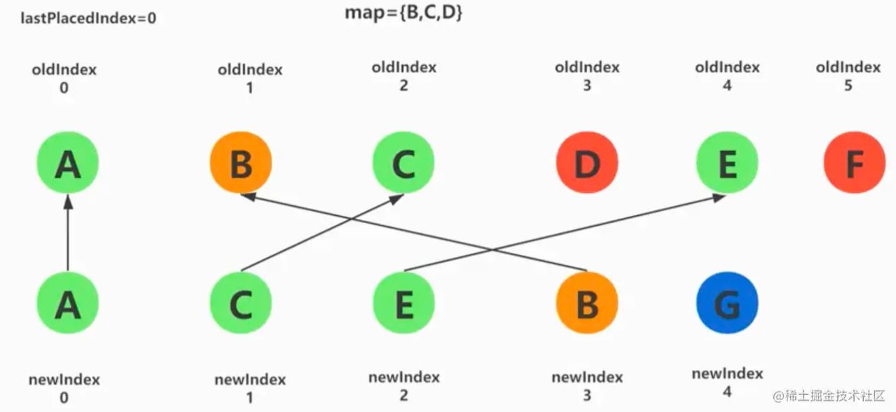- 先出 A,map中如果有A,表示可以复用- 判断 A的老挂载索引和lastPlacedIndex对比,如果索引值大,A节点不需要移动,更新lastPlacedIndex的值;否则循环到B,挂载索引小,需要移动B;循环到G,map中没有值,需要新增;新的数组节点循环完,未用到的老节点全部删除。