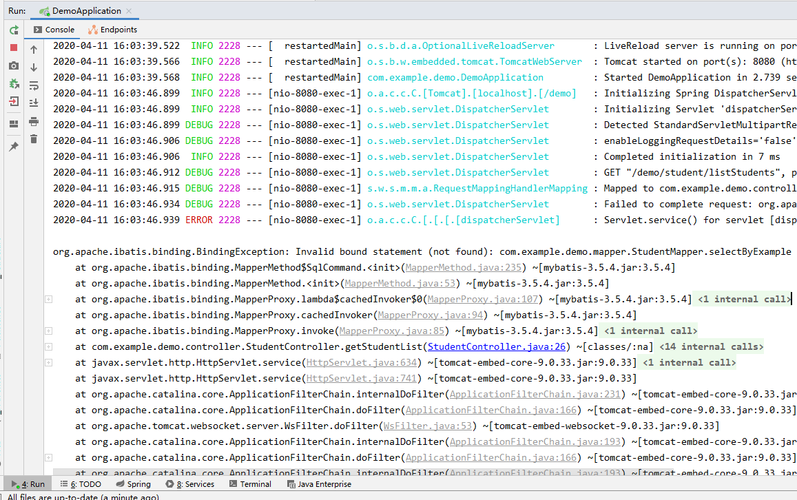 - org.apache.ibatis.binding.BindingException: Invalid bound statement (not found): com.example.demo.mapper.StudentMapper.selectByExample