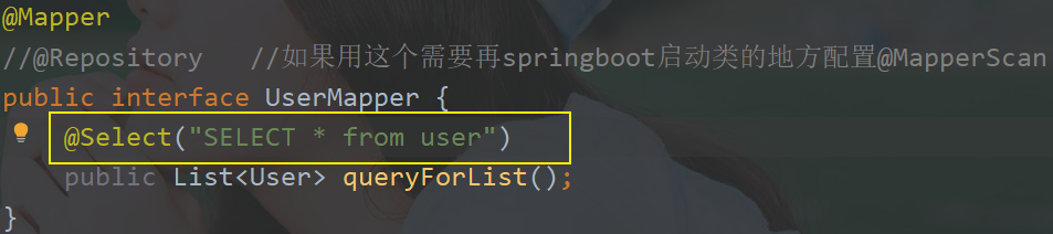 实现接口绑定还可以在mapper接口上,直接使用注解实现,类似: