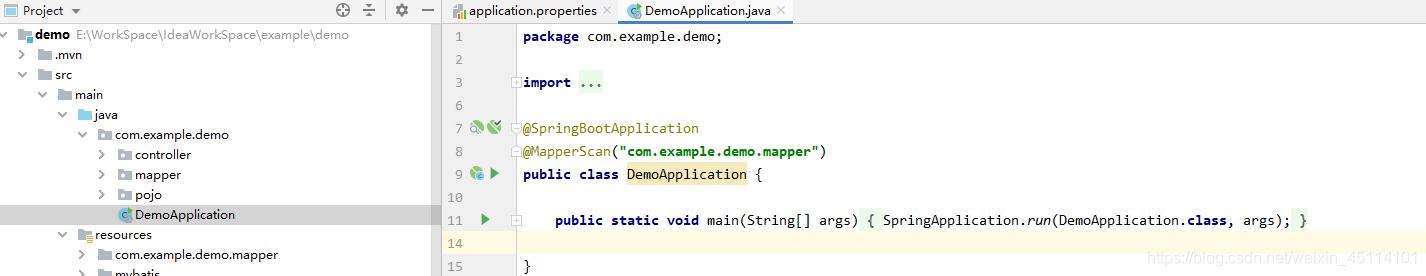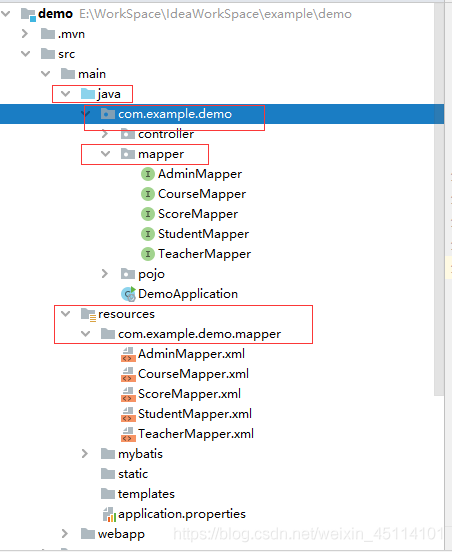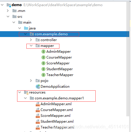 加载到配置中,此时mapper接口和xml文件恰好同放在"com.example.demo.mapper"中