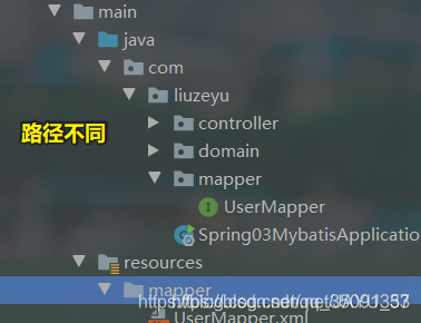 如果我们的mapper接口和mapper映射文件不在相同的目录下 该案例同为"com.example.demo.mapper",则xml映射文件不能被加载到