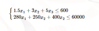 model = (280 * x[1] 250 * x[2] 400 * x[3] <= 60000)