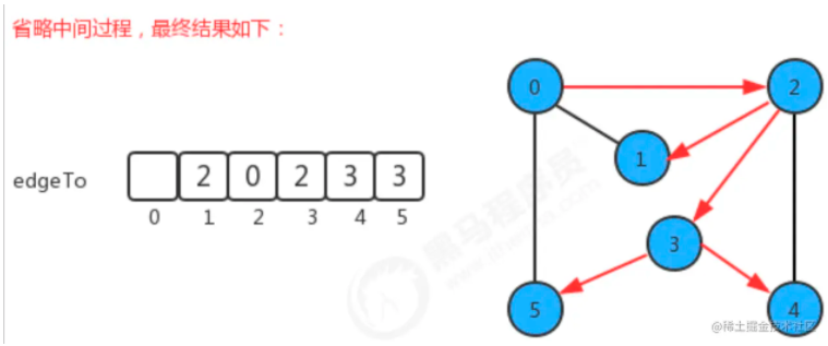 总结来说,就是edgeTo数组的下标表示当前顶点,内容存放上一个节点的数据,根据最终edgeTo的结果,我们很容易能够找到从起点0到任意顶点的路径。