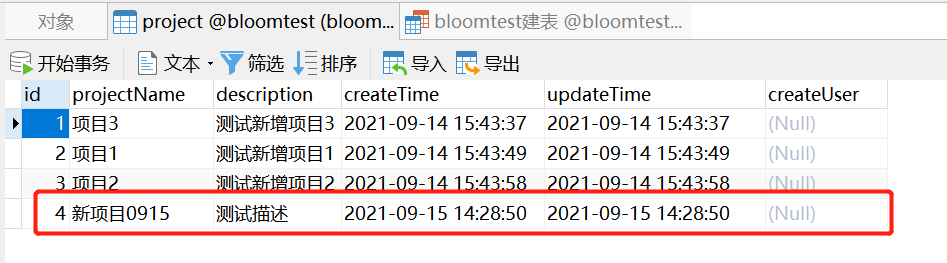 CREATE TABLE `project` ( `id` bigint NOT NULL AUTO_INCREMENT COMMENT '主键ID', `projectName` varchar(30) DEFAULT NULL COMMENT '项目名称', `description` varchar(255) DEFAULT NULL COMMENT '描述', `createTime` datetime NOT NULL DEFAULT '1900-01-01 00:00:00' COMMENT '创建时间', `updateTime` datetime NOT NULL DEFAULT '1900-01-01 00:00:00' COMMENT '更新时间', `createUser` varchar(30) DEFAULT NULL COMMENT '创建人', PRIMARY KEY (`id`) ) ENGINE=InnoDB AUTO_INCREMENT=1 DEFAULT CHARSET=utf8 COMMENT='项目表';