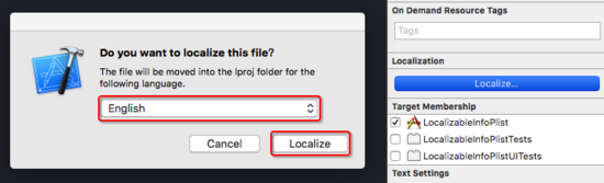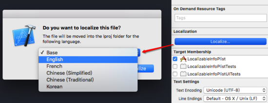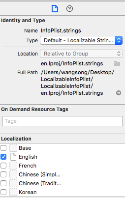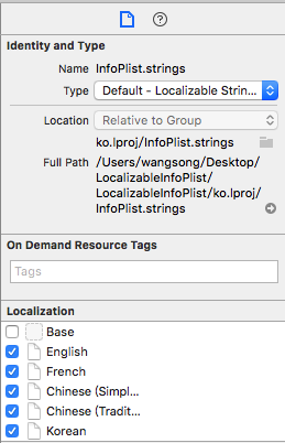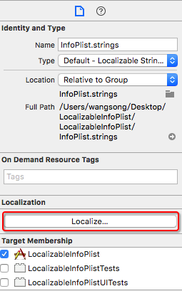 选中InfoPlist.strings,在Xcode的File inspection(Xcode右侧文件检查器)中点击Localize,目的是选择我们需要本地化的语言,如下图: