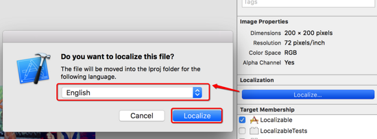 将图片拖入工程中,例如“icon.png”,然后选中icon.png,展开Xcode右侧的file Inspection,点击Localize,如下图:
