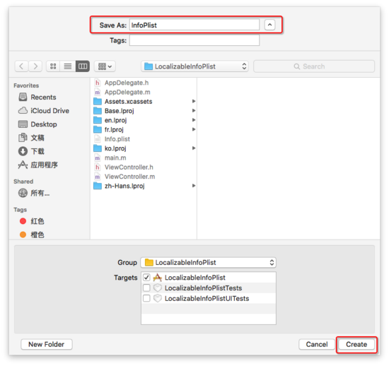 点击create后,Xcode左侧导航列表就会出现名为InfoPlist.strings的文件,如下图: