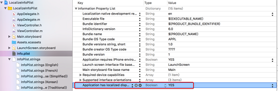 备注: 过去本地化App名称,需要在Info.plist文件中增加一个名为“Application has localized display name”的BOOL类型的Key,并且需要将其值设置为YES(如下图)。目的是让App支持本地化App名称。 但现在可以忽略这一步 。