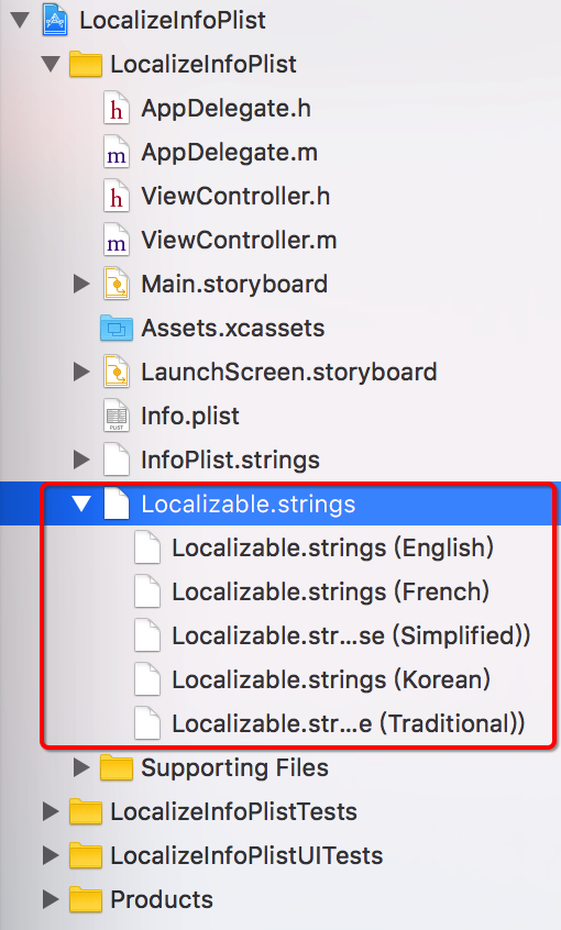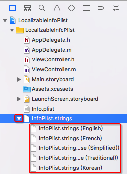 从上图可以看出,InfoPlist.strings文件下包含了English、French、Chinese(Simplified)、Chinese(Traditional)、Korean这五种语言的文件。