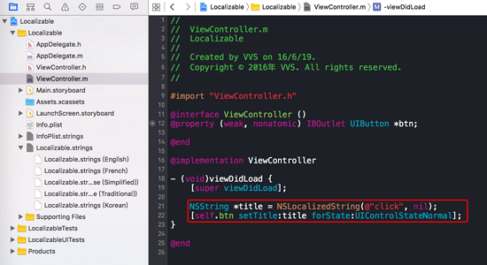 我们只需要使用Foundation框架自带的NSLocalizedString(key, comment)这个宏根据Key获取对应的字符串,然后赋值给代码中的字符串。
