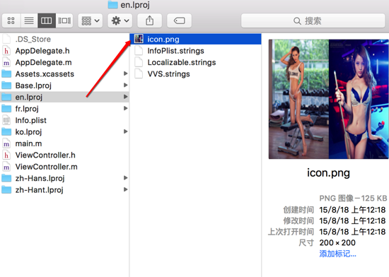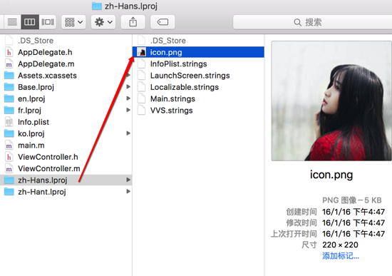 我们只需给zh-Hans.Iproj添加一个名字也为icon.png的图片。如下图: