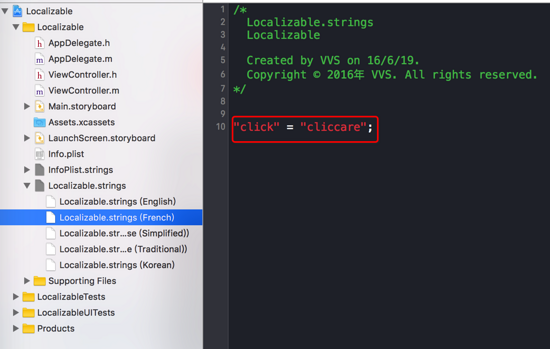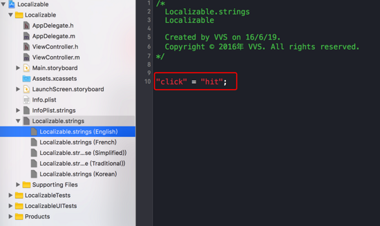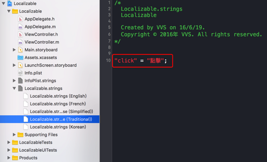 然后我们只需要在Localizable.strings下对应的文件中,分别以Key-Value的形式,为代码中每一个需要本地化的字符串赋值,如下图: