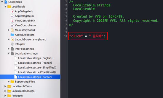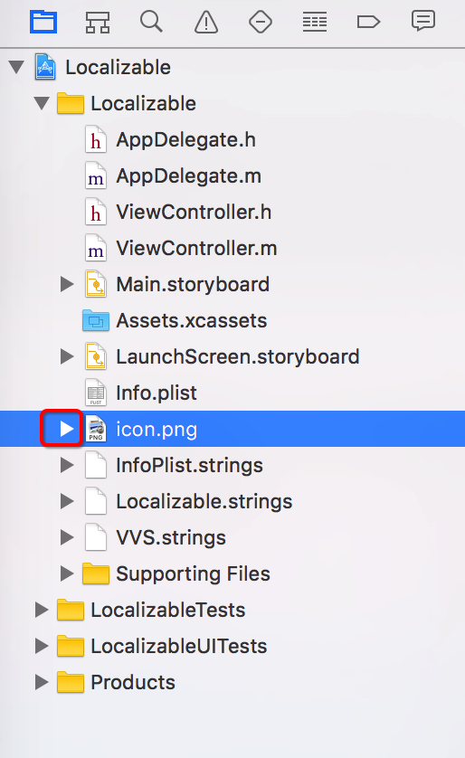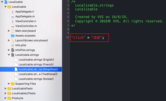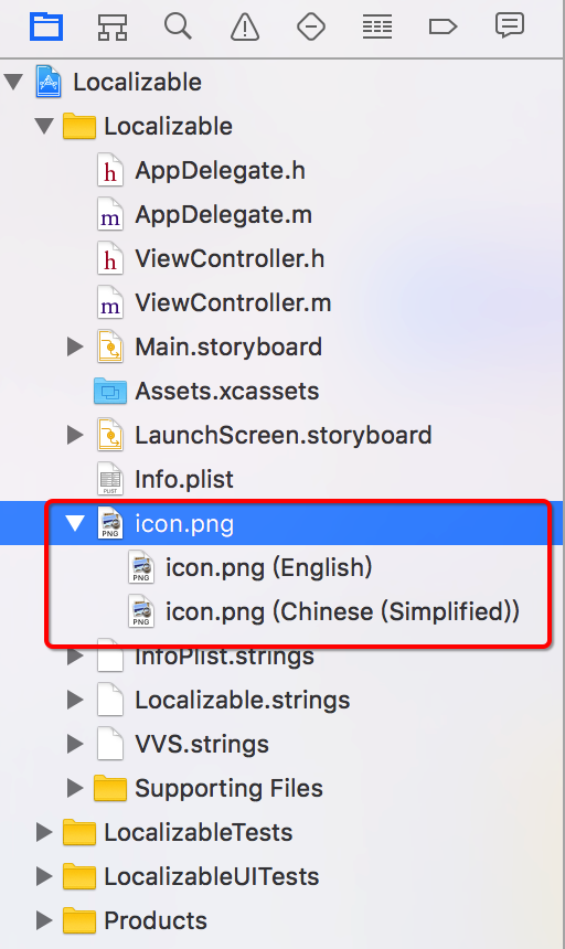 文件创建成功,查看Xcode左侧导航列表,发现多了一个名为Localizable.strings的文件,如下图: