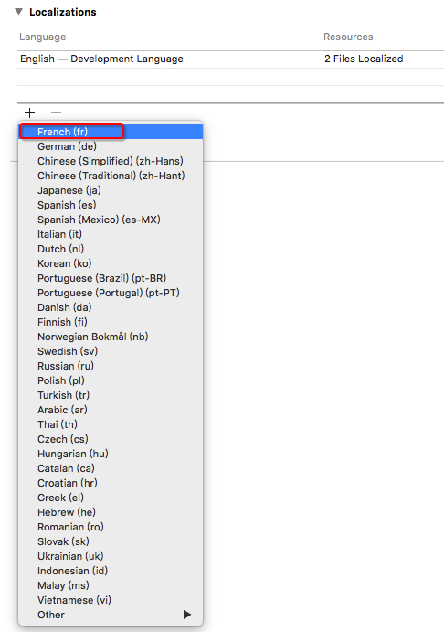 选中project->Info->Localizations,然后点击" ",添加需要国际化/本地化的语言,如下图(默认需要勾选Use Base Internationalization):