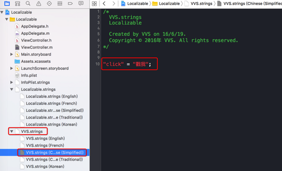 也就是说,如果你的strings文件名字不是Localizable而是自定义的话,如VVS.strings,那么你就得使用NSLocalizedStringFromTable这个宏来读取本地化字符串。