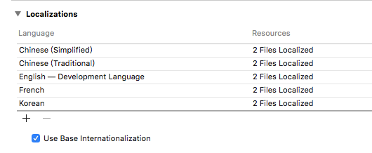 首先需要添加需要本地化的语言,具体步骤参考第一章 配置需要国际化的语言 。因为我演示的demo中在本地化App名称时已经添加了需要国际化的语言。所以不需要再设置。