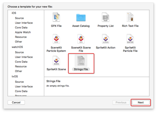 和应用名称本地化一样,首先需要command N,选择iOS -> Resource -> Strings File