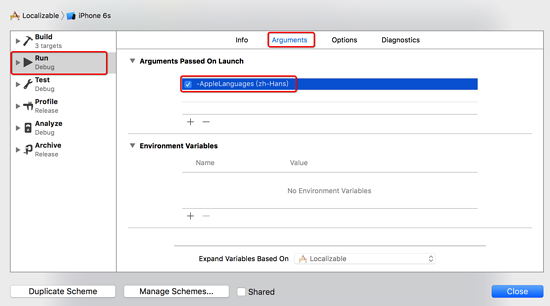 其实,我们不需要给Localizable.strings(English)文件添加Key-Value。原因如下:系统根据某个key去获取对应的字符串时,如果没有找到,那么就会以key作为value返回。所以如果我们在Localizable.strings(English)文件中没有添加 click = "hit";那么在english环境下btn最终显示的title会是click. 切换语言无需在模拟器中设置,只需要在Xcode中进行如下设置: Edit->Scheme->Run->Arguments Passed On Launch ->-AppleLanguages (语言代码)。例如,我们模拟器此时虽然是韩语,如果通过上述步骤设置为zh-Hans,那么语言环境将会变为汉语,如下图: