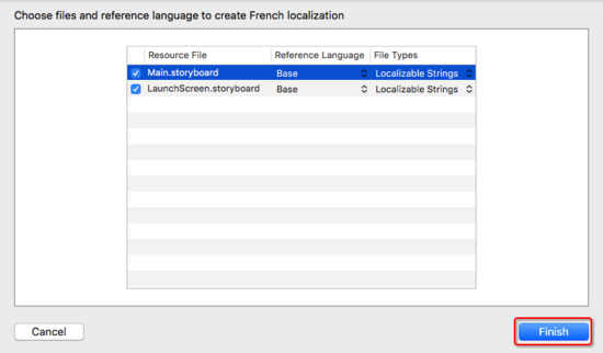 注意: 如果我们没有在 PROJECT 中配置需要国际化的语言(project->Info->Localizations,然后点击" "),上图下拉列表中将只会出现"Base"和"English"选项,English语言是系统默认的语言,其他需要国际化的语言(例如中文简体、法语)必须通过上面的 配置本地化语言 那一步手动添加。