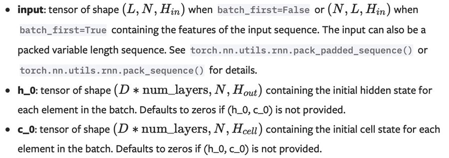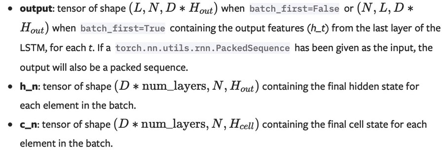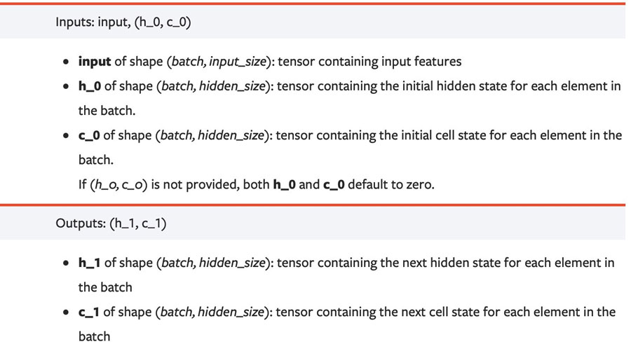 它的__init__方法的参数设置与LSTM类似,但是没有num_layers参数,因为这就是一个细胞单元,谈不上多少层和是否双向。forward的输入和输出与LSTM均有所不同: