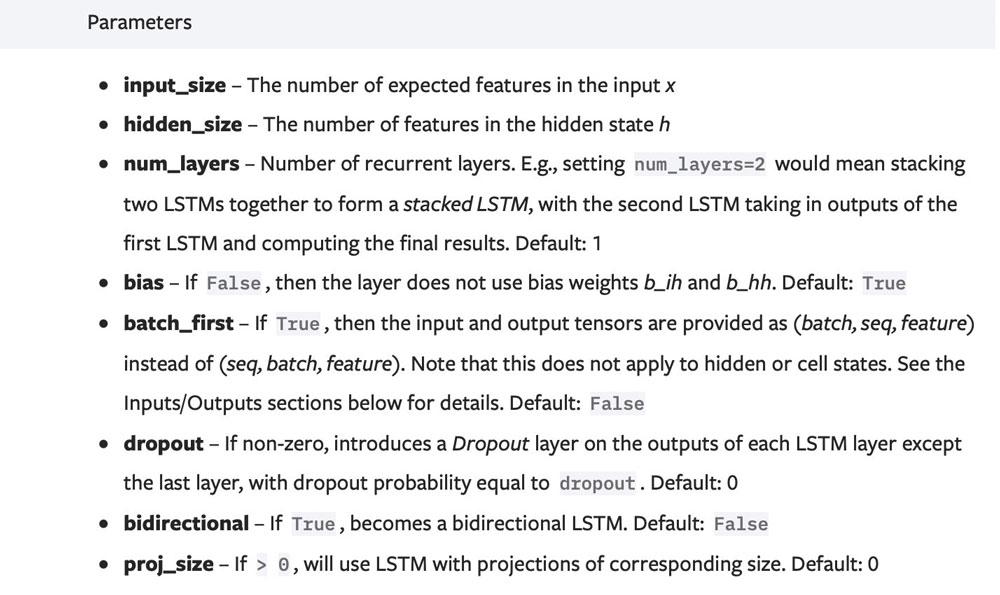 首先对nn.LSTM类进行实例化,需要传入的参数如下图所示: