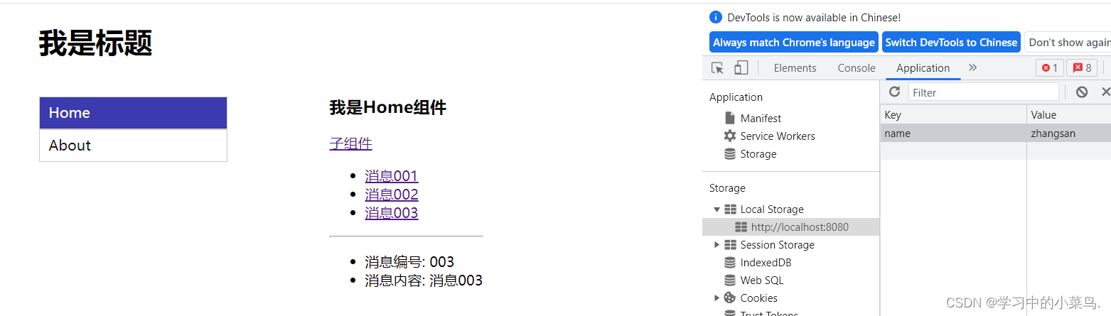 当 Local Storage 里面存储的 name 是 zhangsan 的时候, 点击消息才显示消息内容