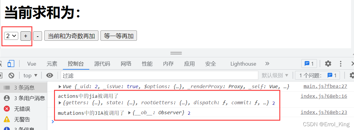 });到此为止,功能就实现了,你发现了吗,这里做了些优化,由于 index.js 中的 jia、jian方法里边什么都没做,直接就 commit 给了 mutation,而 vc 是可以直接对话 Mutations 的,如下图: