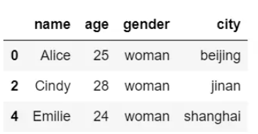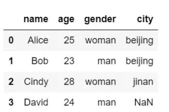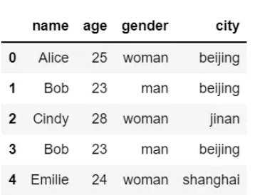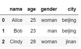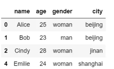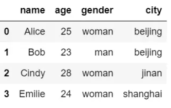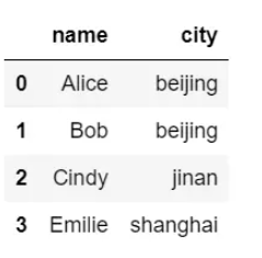 data = {"name": ["Alice", "Bob", "Cindy", "Emilie"], "city": ["beijing", "beijing", "jinan", "shanghai"]}