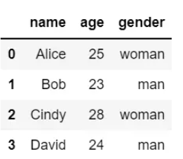 data = {"name": ["Alice", "Bob", "Cindy", "David"], "age": [25, 23, 28, 24], "gender": ["woman", "man", "woman", "man"]}