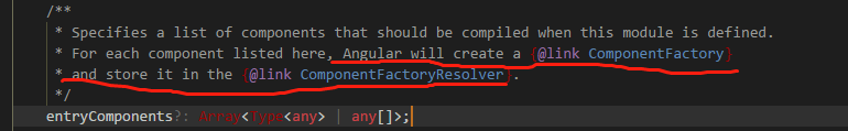 那entryComponents这个配置项是做什么的呢?看源码注释,大概意思就是:Angular会为此配置项中的组件创建一个ComponentFactory,并存放在ComponentFactoryResolver中。动态添加组件时,需要用到组件工厂,所以此配置是必不可少的。