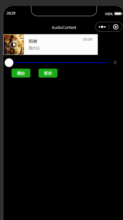 本例通过wx.createAudioContext()接口湖区AudioContext实例,然后调用播放和暂停功能,最后用slider组件来定位播放位置。